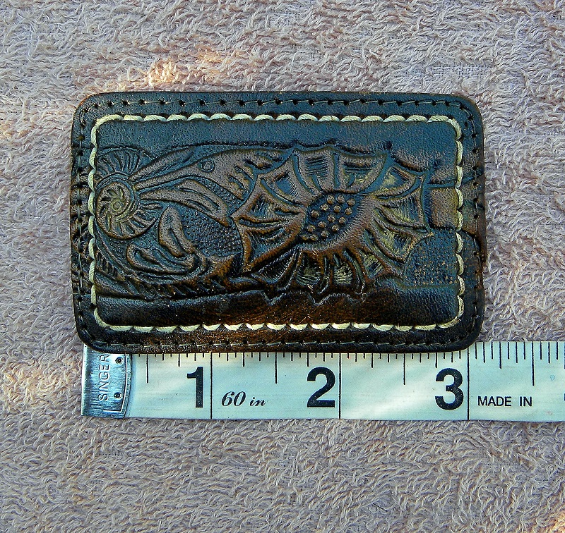 For Sale: Vintage preowned Tooled leather Belt Buckle. Rectangle post/hole western style. Will fit up to 1.5" belt leather. 3" Long X 2" tall. 2 color: dark chocolate brown with lite brown accents. Light top stitching. Good condition.