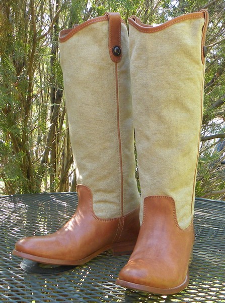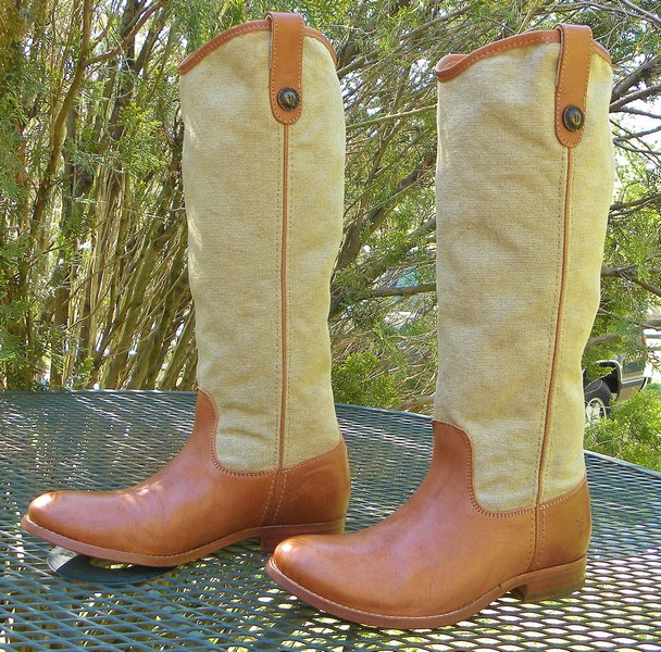For Sale: Gently used Vintage 15" tall FRYE Brown leather/Tan Canvas Western Boots for Women size 7B. Perfect for summer travel and riding . The Frye Logo stenciled in the outer heel and bottom sole. Made in Mexico.