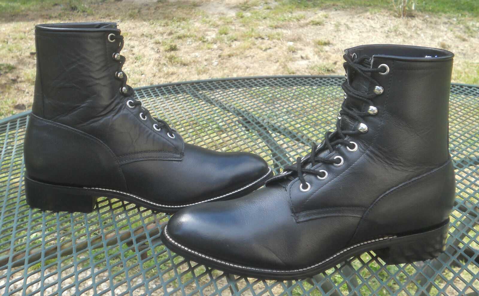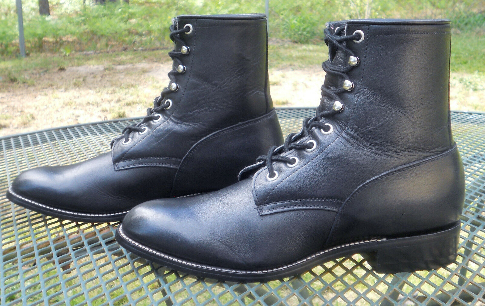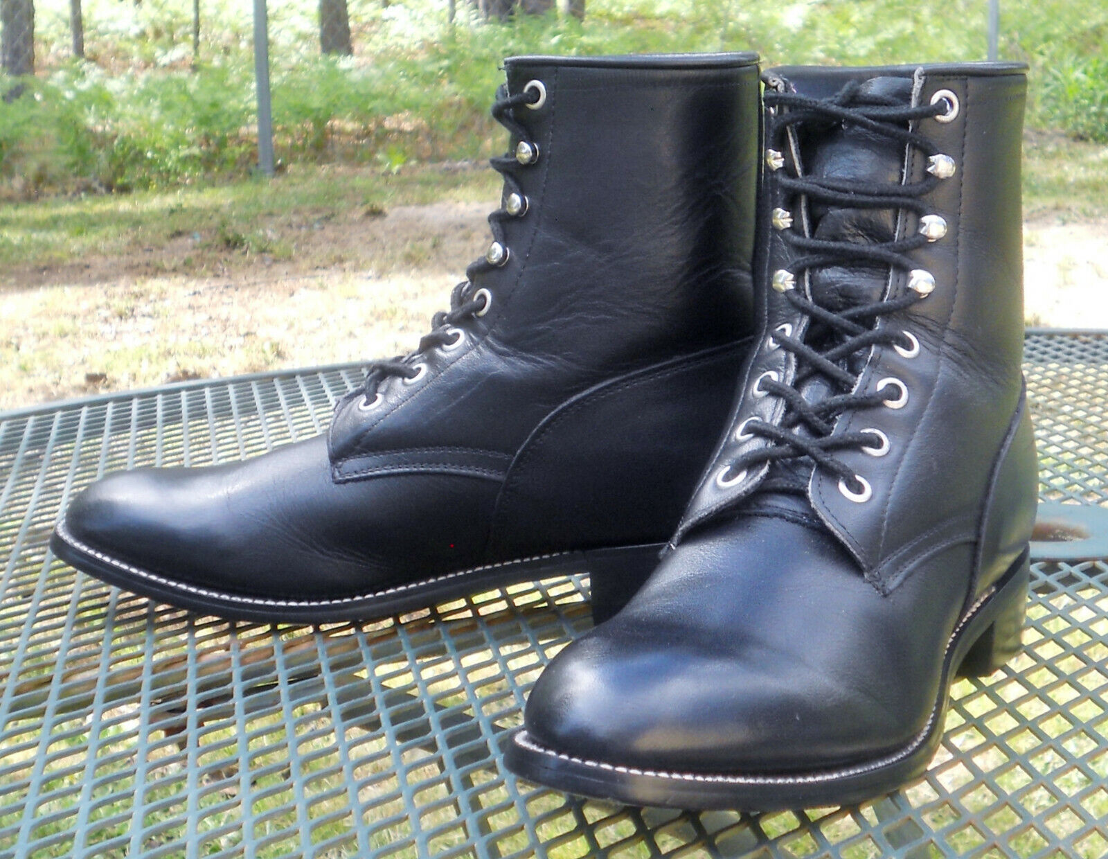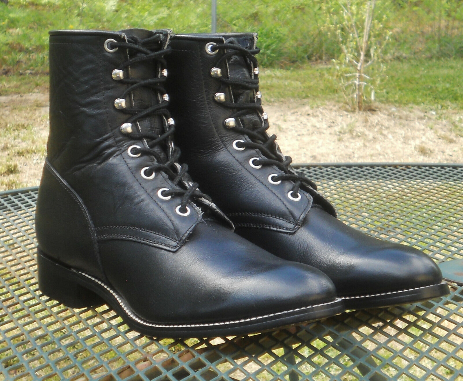 You are viewing a pair of preowned black Leather Paddock/ Jodhpur Boots by JUSTIN BOOT CO for Youth in size 5D, but please measure your foot or another pair of your boots with roper toes that fits well & then refer ONLY to the measurements listed in this description. Justin Roper's run bigger. These Classic black lace up Justin Original Ropers (506Y) are leather, have 6.25" upper shafts, synthetic smooth bottom sole with a Justin logo heel cap on a low block sole, roper toes and light top stitching around the sole. These boots are some of the most popular Paddock Ropers on the planet. They have a serious, professional appearance that looks good all the time. Go to the barn or go to the show. SHARP Boots! Condition: There is wear on these boots consistent with minor use to include: very slight creasing across the top of the toe area, rubs & scuffs. The bottom soles have minor wear except on the back edge of the heel. The inside leather lining looks good.. These leather boots have a nice sheen. PLEASE LOOK at all Photos so that you will know exactly what you are buying. OUTER Measurements: Length (along the side of the foot) ) Heel to Toe: 10 & 7/8"~ Across ball of the foot:3.5" ~ Heel height: 7/8"~ Shaft height from top of heel: 6.25".