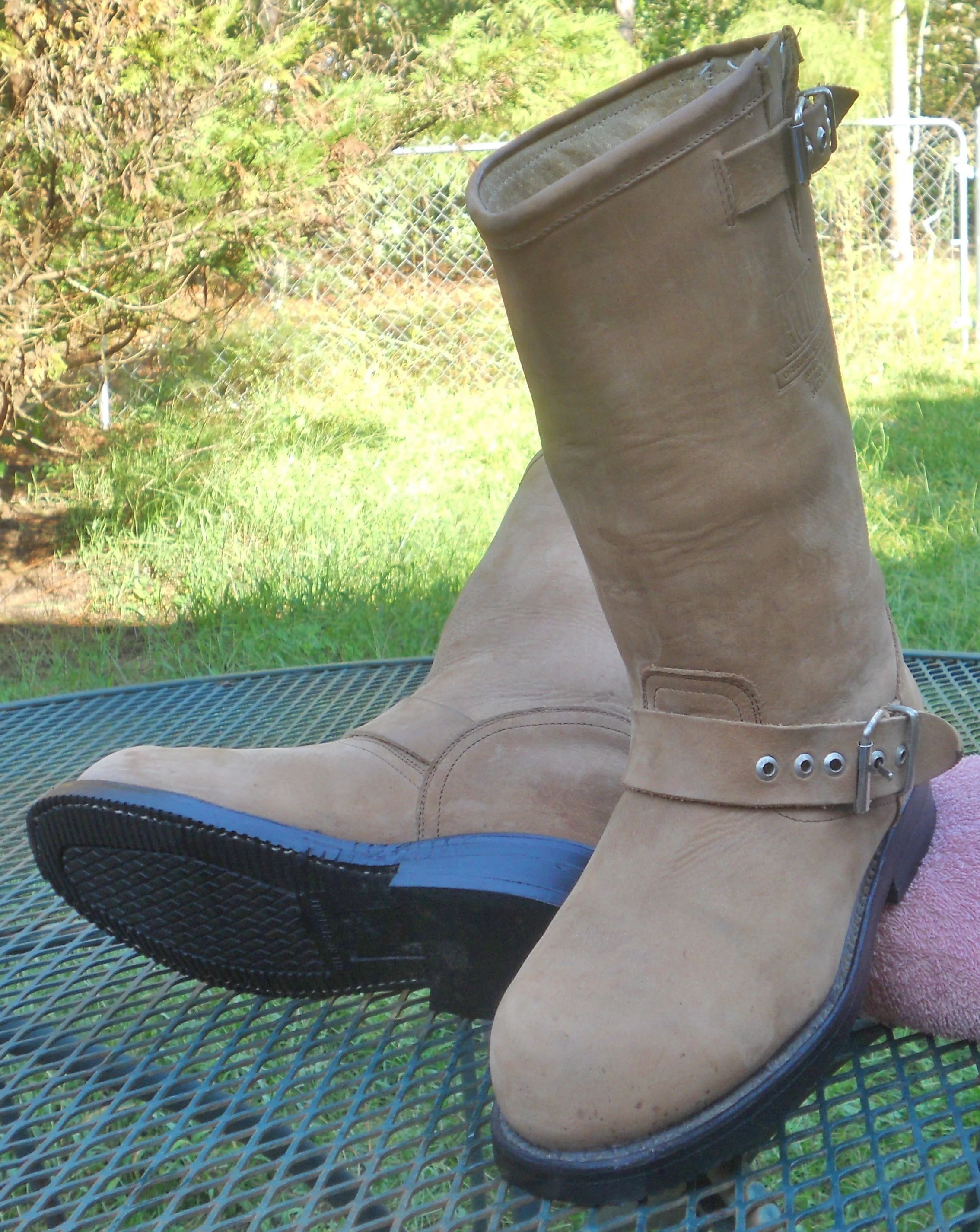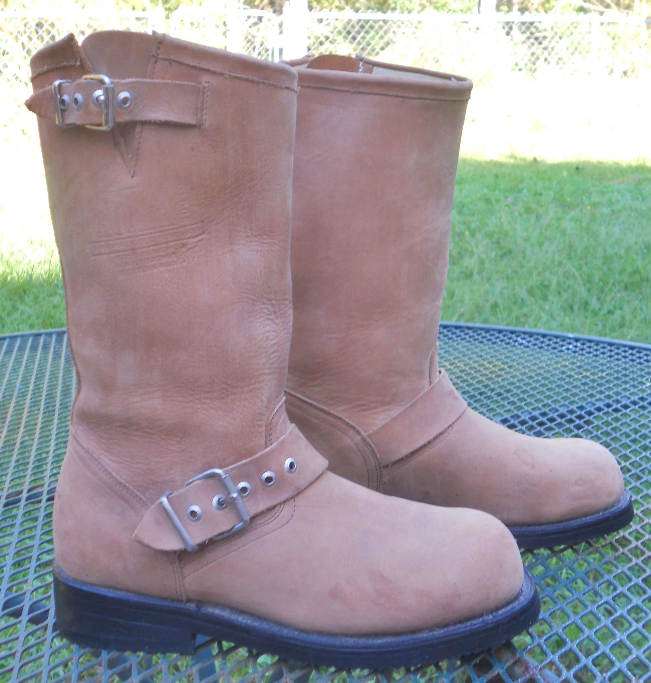 You are viewing a pair of preowned Tan Leather Western Moto Boots by AGUILA BOOTS in womens size 6, but measure your feet or a good fitting pair of your boots with the same toe and always refer to the measurements below! Each Maker sizes differently. Inside it says 36 which equates out to USA size 6., but they measure about a 6.5-7. These pull on 10.5" shaft Engineer style boots have traditional over-the-arch adjustable buckles and smaller buckles straps on the upper edge. These Biker boots have stacked low slung block heels, synthetic semi-corrugated no-slip soles with a Goodyear welt, and round toes. The Aguila Boot Co is stenciled into the leather on the uppers. A classy Biker Boot! Please NOTE: These are GENUINE AGUILA BOOTS>>>NOT to be confused with a MUCH CHEAPER boot called AGUILA REAL: (the ones with very long toes). Condition: The exterior leather shows wear consistent with average use to include: creasing across the foot top, rubs, dark areas, scuffing, some black marks and a few water marks.. (see pics) The inner lining is clean. The bottom leather soles have wear. Please view ALL 10 photos to see exactly what you are buying. OUTER Measurements: length heel to toe (along the side of the foot): 9.75"--Width (across ball of foot): 3.75" --heel height: .75"--Shaft height: 10.5". Thanks for looking.