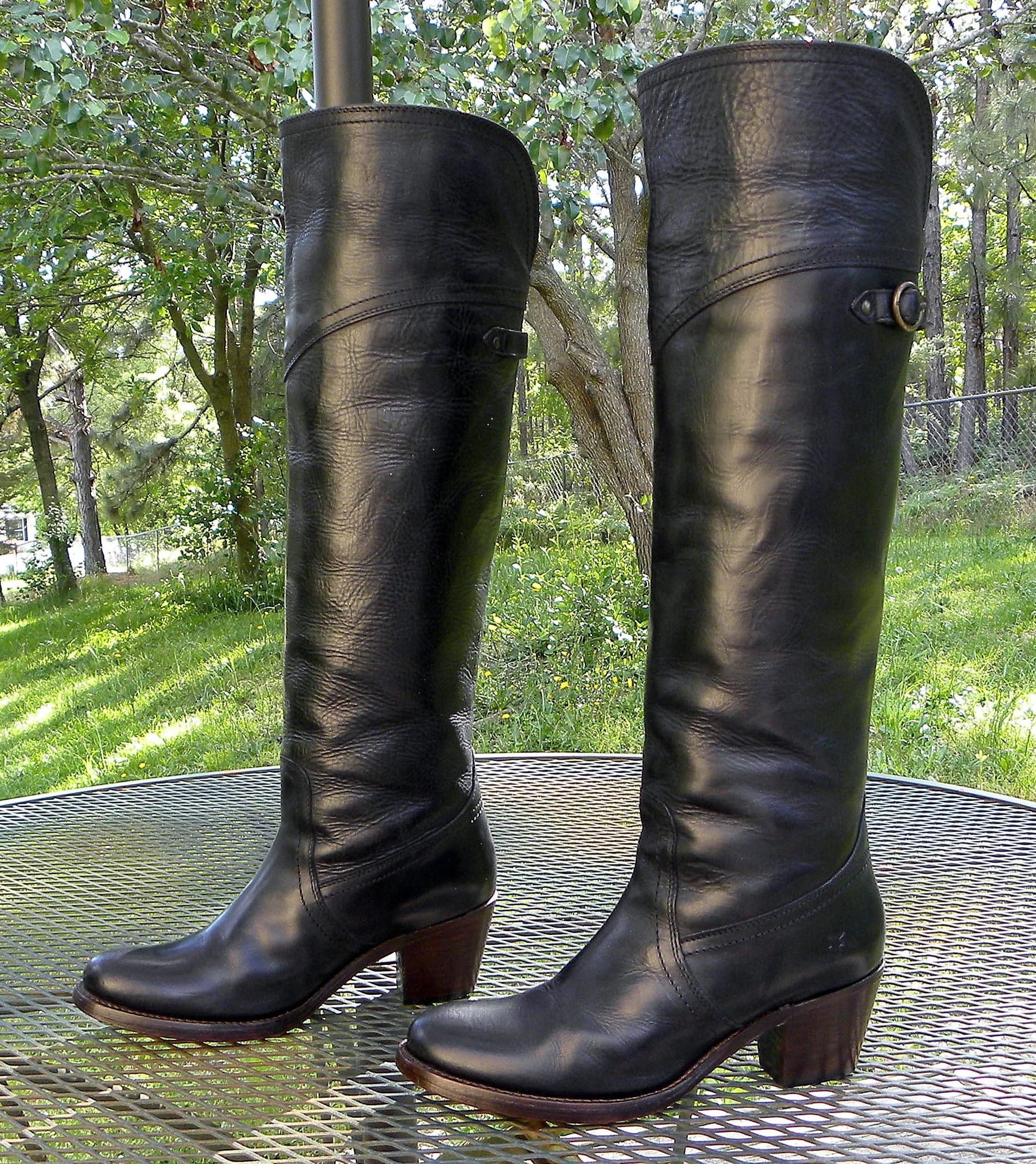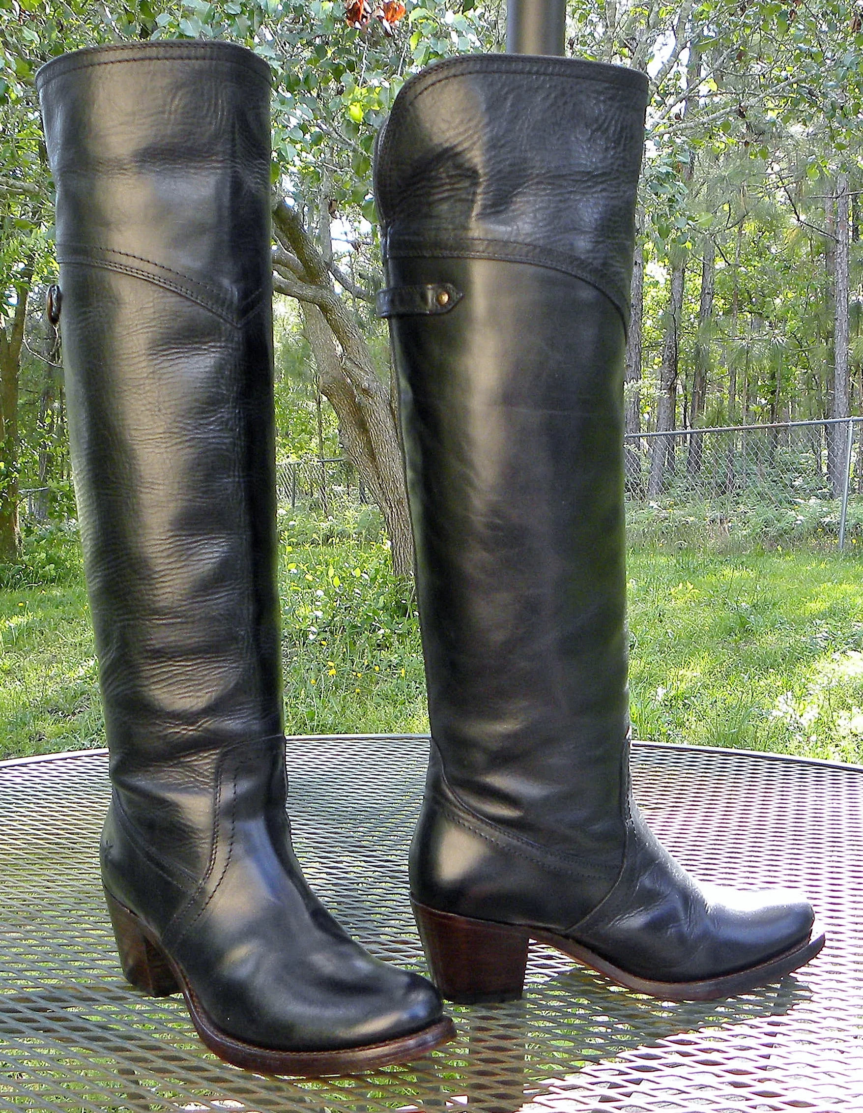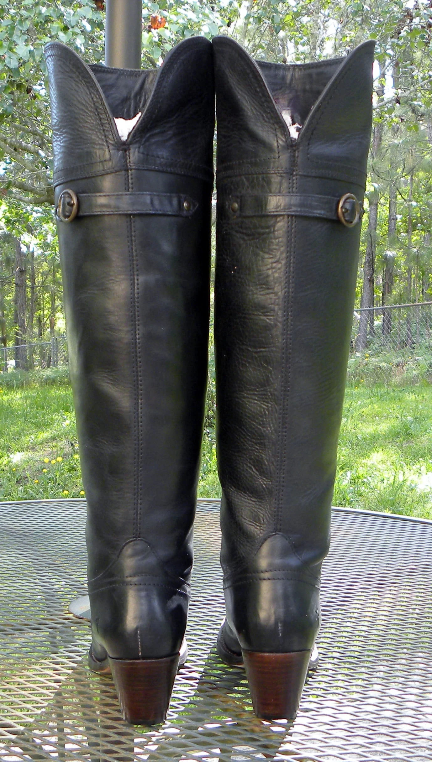 For Sale: Gently used Vintage 19" tall OTK FRYE Black leather Western Boots for Women size 7B. Upper rear open in back (pirate style) Frye Logo stenciled in outer heels. Made in Mexico.