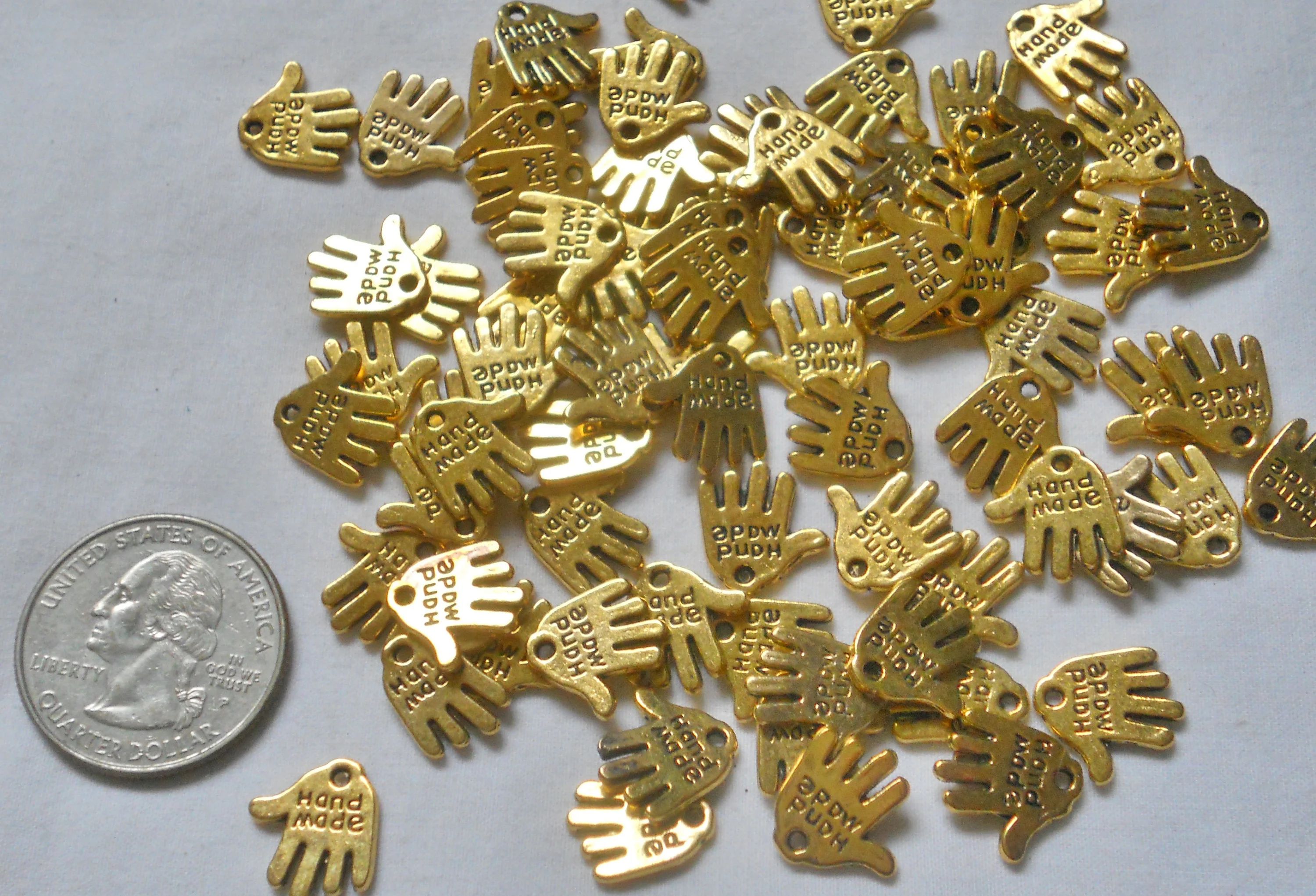 Quantity 80 –Little  Hand Charms saying "Hand Made"  13mm X 12mm Goldtone metal Alloy Charm Quantity 80 –Little  Hand Charms saying "Hand Made"  13mm X 12mm Goldtone metal Alloy Charm