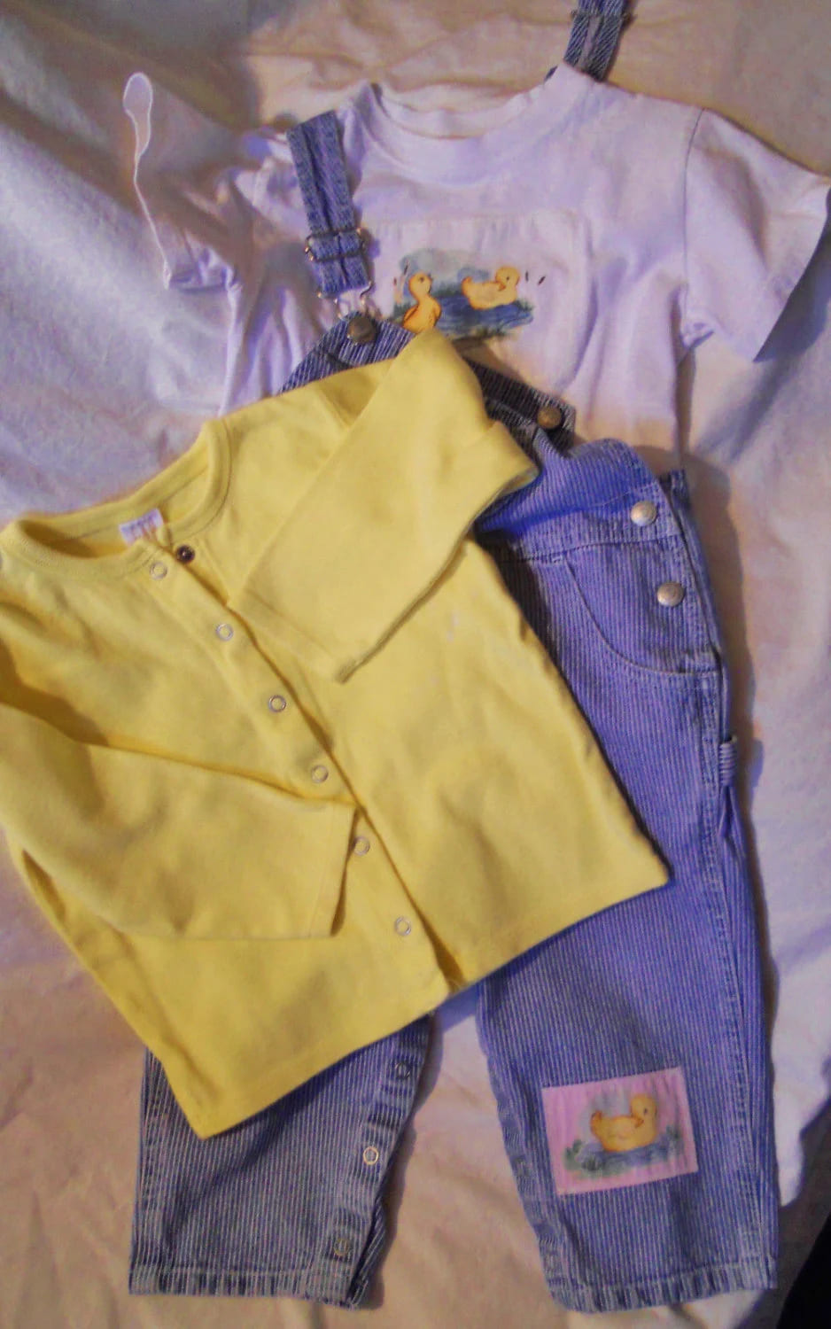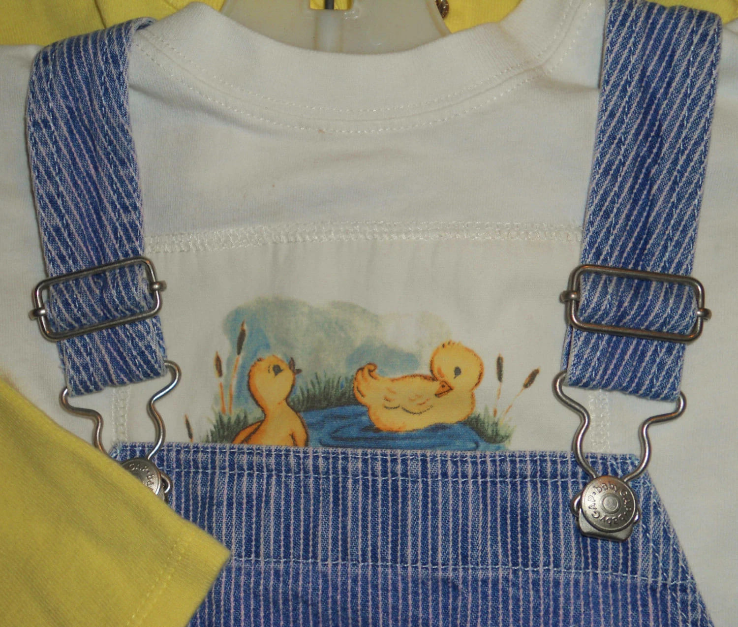 You are viewing a set of preowned VINTAGE "Duck Duck Goose " Baby GAP 3 Piece Outfit in Baby/Toddler 2XL=3T. The set consists of a short sleeved white T-shirt top w/a 28" chest with cute Duckies on the front, a pair of blue Denim Overalls (Railroad stripe) and an oversized 4T yellow knit cotton cardigan. These classic railroad striped overalls have a ducky patch on the lower leg and adjustable buckles over the shoulder that snap over riveted GAP buttons, twin snaps on each hip opening, 5 pockets and a snap crotch/legs: Waist: 26"--Inseam: 11"--Total overall length from shoulder to hemline" 29". There is a "Duck Duck Goose" patch across the front front chest bug pocket. The Cardigan Jacket snaps down the front. The pictures portrays this Rare outfit well. Please look at all the photos so that you know exactly what you are buying. Fabric: 100% Cotton. This Set is in good used condition except the ducky PATCH on the leg has a slight pinkish tint to the background. If you are interested in Vintage Kids Brand name & eclectic items, Favorite me. I will be slowly listing many neat items! Thanks for looking!