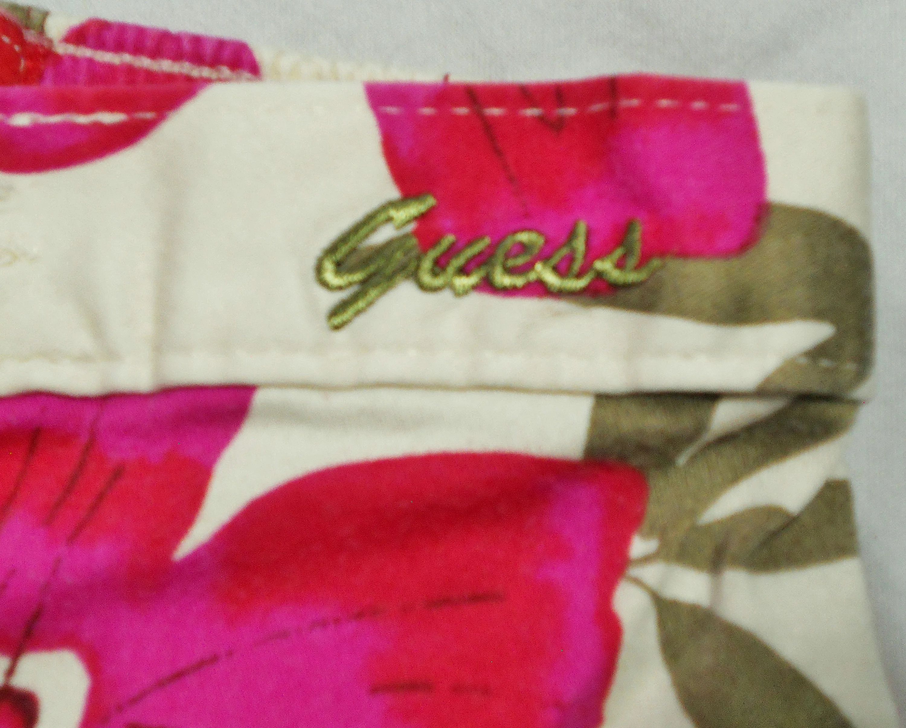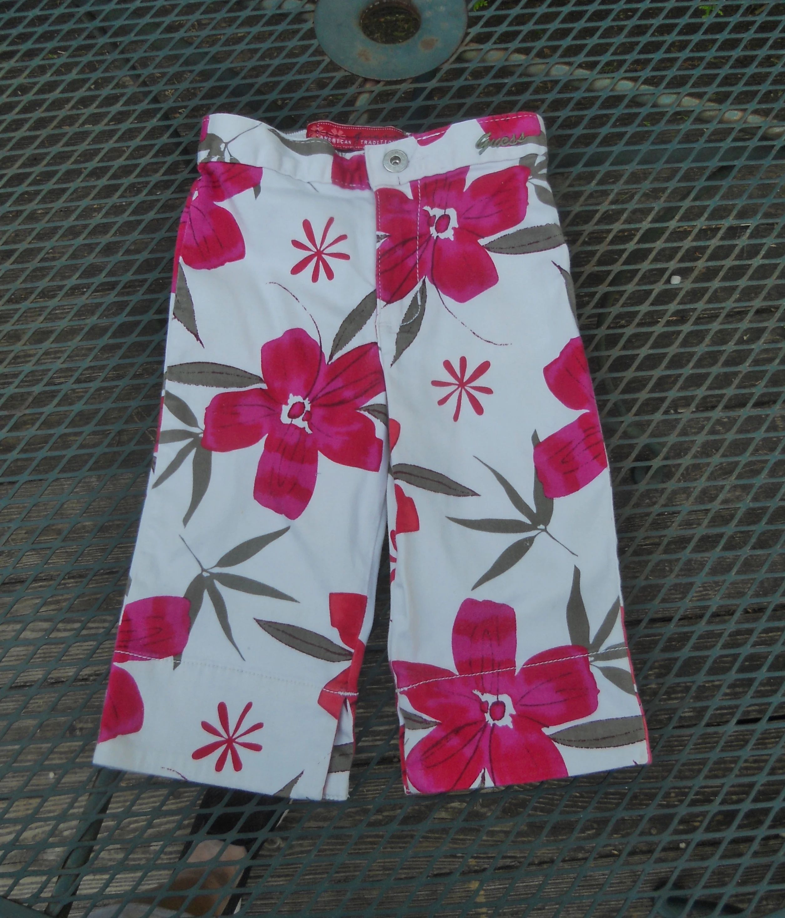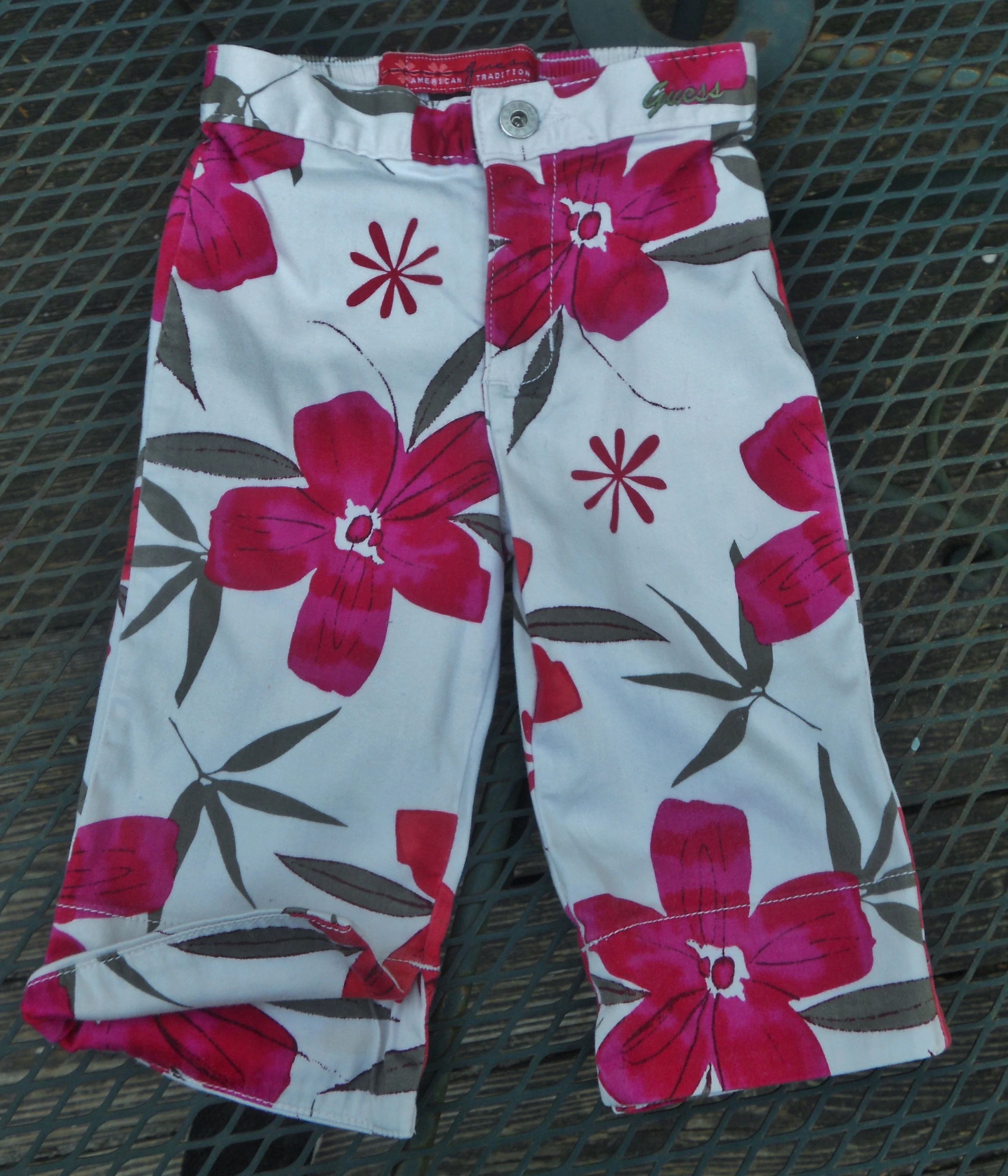 You are viewing a preowned pair of Vintage GUESS long Hawaiian print Jams/Capris in size Girls 4=(Waist: =19-22"~ Inseam: 9"). A Signature "GUESS" logo in an olive colored cursive is embroidered on the front waistband. These long walking jams have a 3" front zippered fly with a riveted GUESS logo button above it, rear elastic waist, 2 rear cut-out pockets, and notch-outs at the knees. 97% Cotton -3% Spandex. Made in El Salvador. These are in good condition. If you are interested in Vintage Kids Brand name & eclectic items, Favorite me. I will be slowly listing many neat items! Thanks for looking!