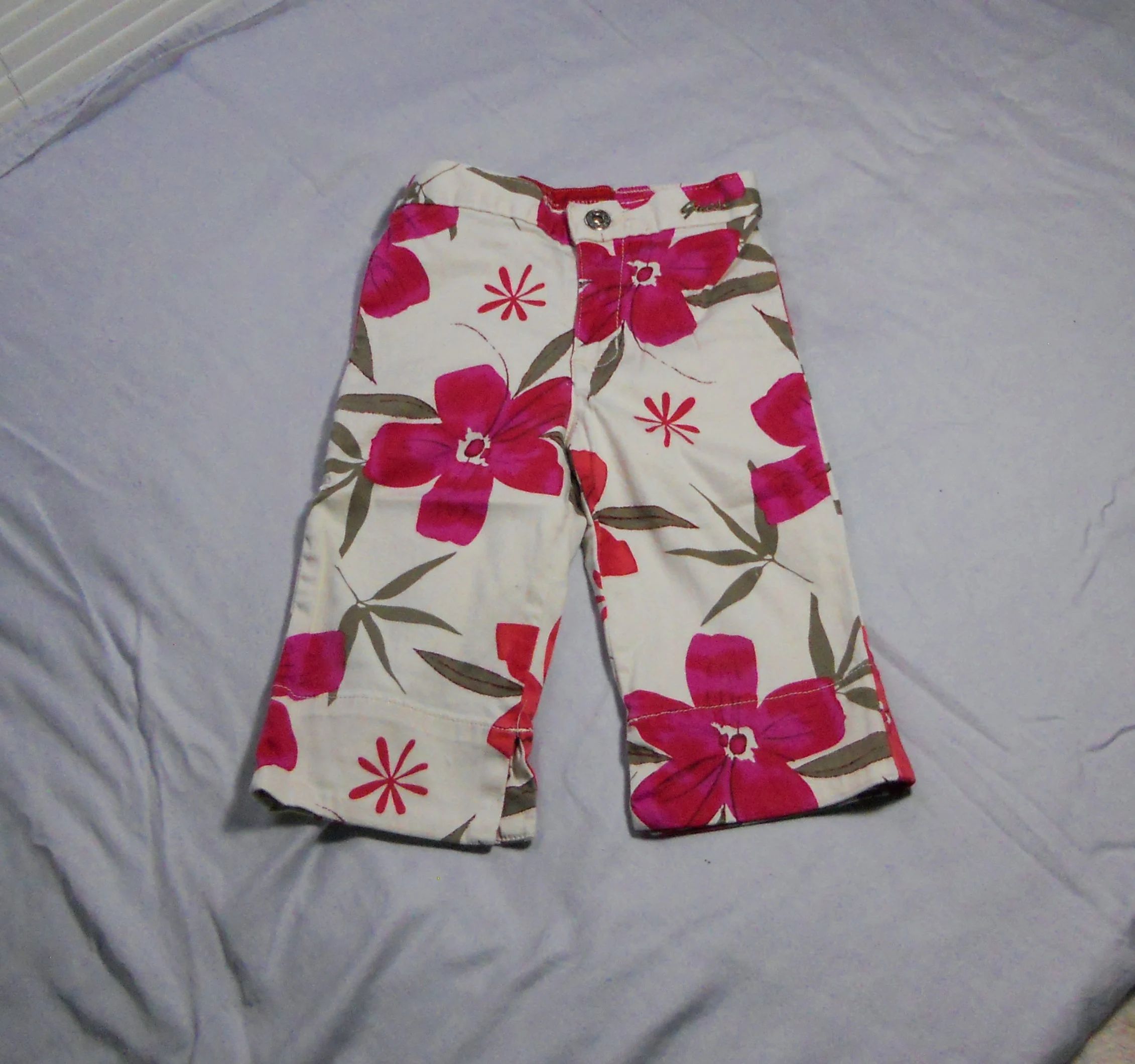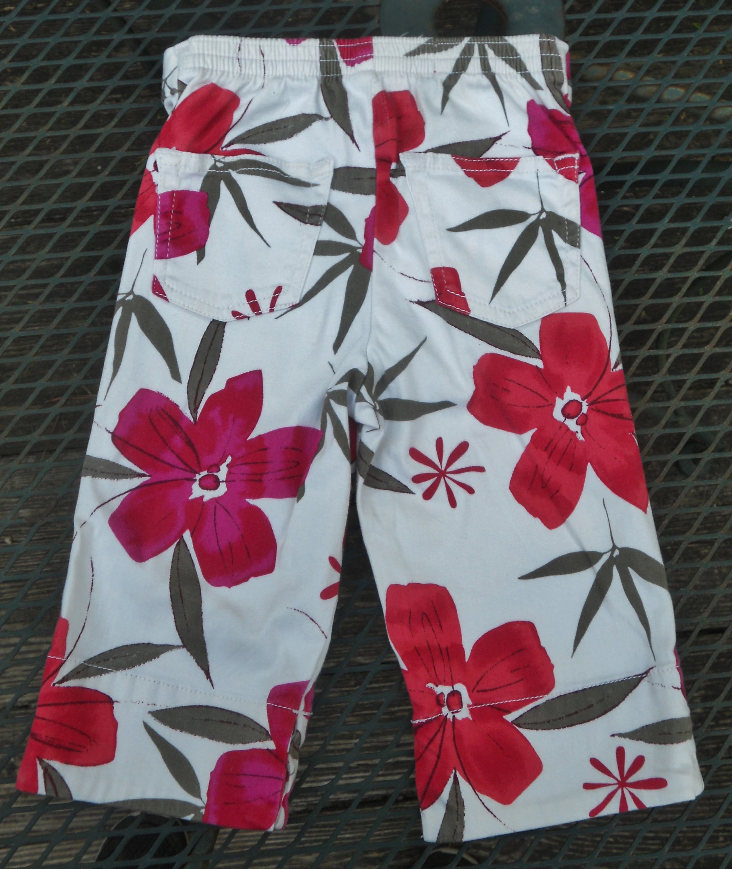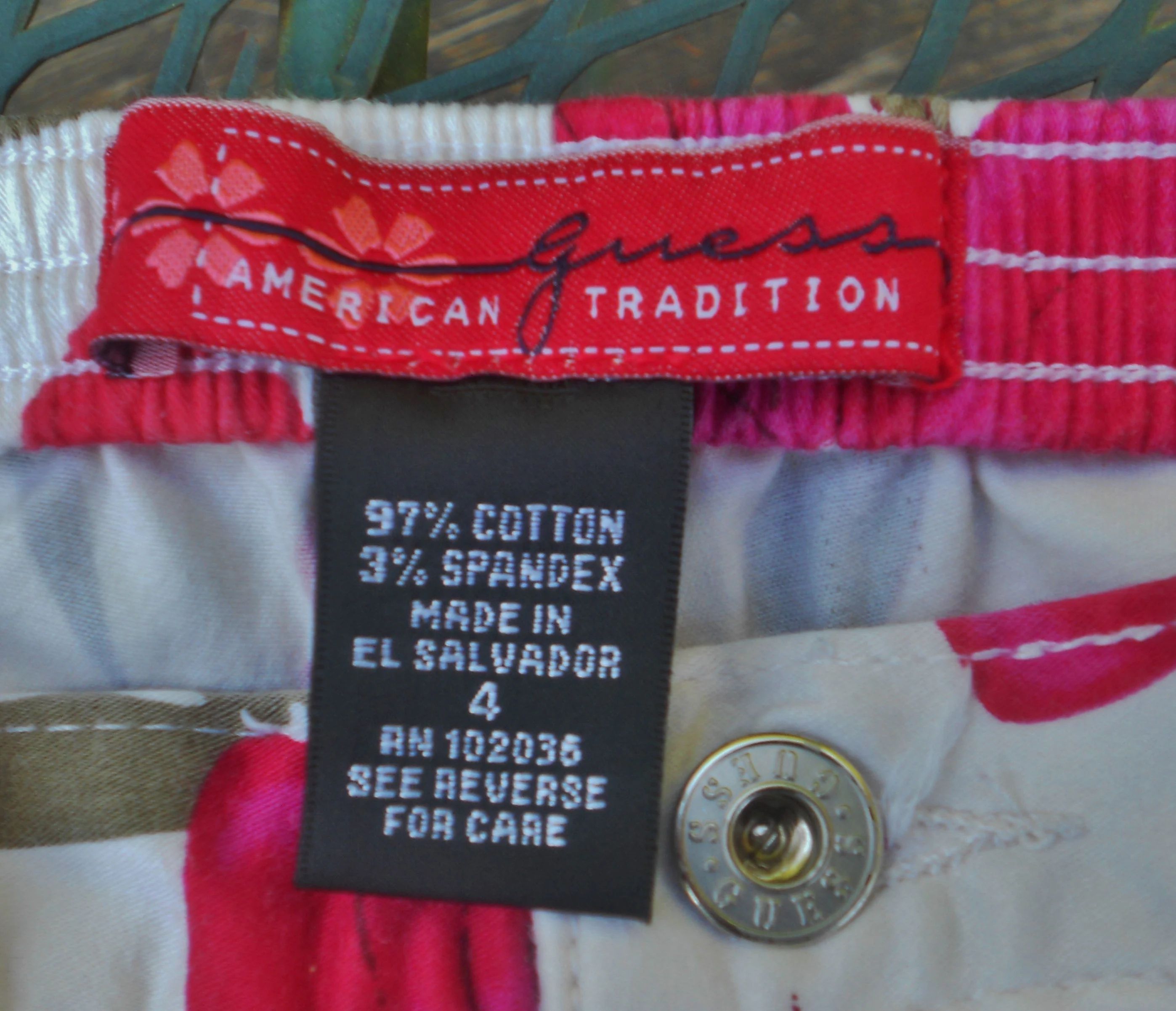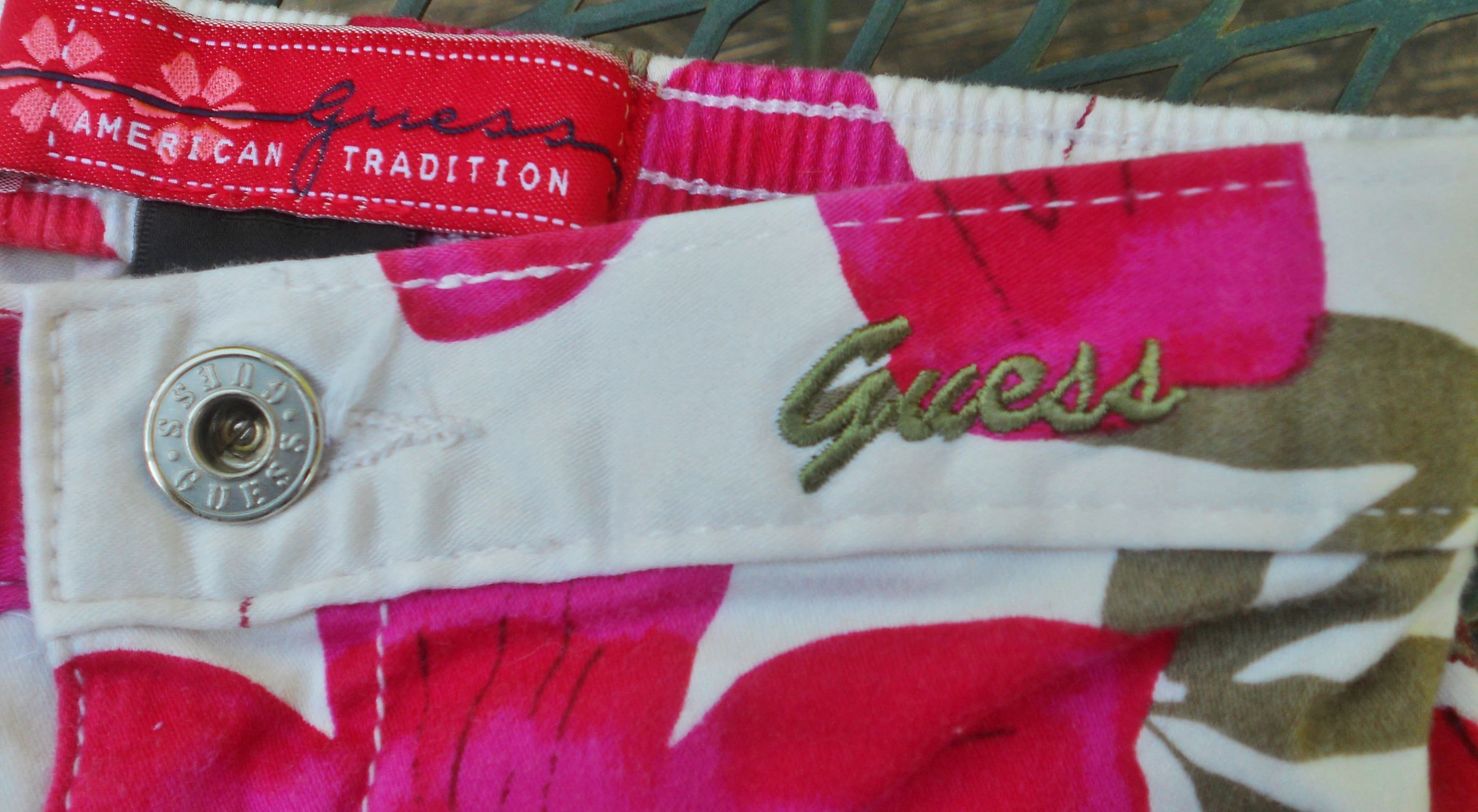 You are viewing a preowned pair of Vintage GUESS long Hawaiian print Jams/Capris in size Girls 4=(Waist: =19-22"~ Inseam: 9"). A Signature "GUESS" logo in an olive colored cursive is embroidered on the front waistband. These long walking jams have a 3" front zippered fly with a riveted GUESS logo button above it, rear elastic waist, 2 rear cut-out pockets, and notch-outs at the knees. 97% Cotton -3% Spandex. Made in El Salvador. These are in good condition. If you are interested in Vintage Kids Brand name & eclectic items, Favorite me. I will be slowly listing many neat items! Thanks for looking!
