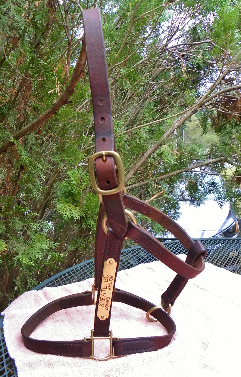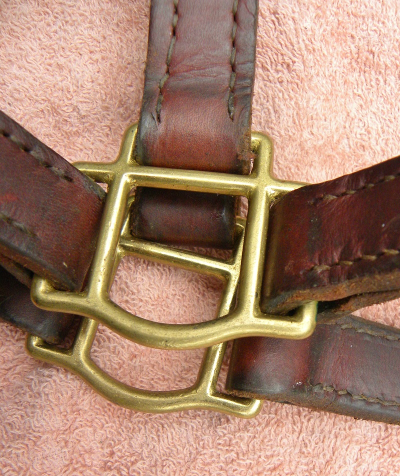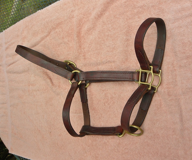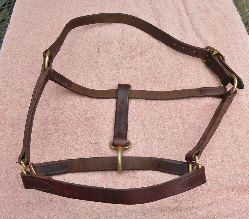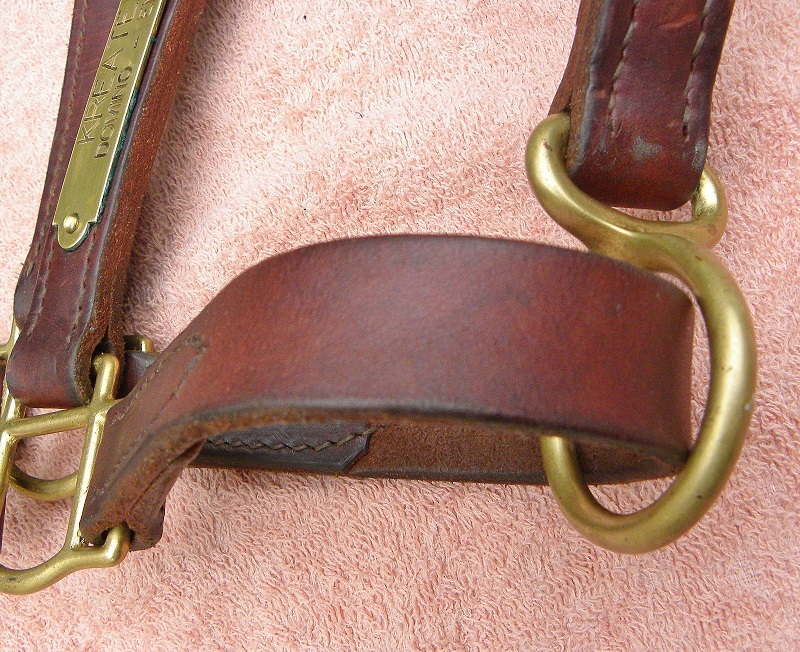 For Sale: Vintage preowned brown Leather Horse Halter For Sale, Horse size: Brass Buckle with adjustable head piece. Double thick leather sides with bottom ring for lead rope. The hardware is solid brass and there's a brass plate reading "Kreate BC" on the side. Condition: This is a SOUND nice older leather halter with great seasoning & a good body. It has some discolorations & dings which just adds to its beauty. Dress it up with a sheepskin over the nosepiece !! You can order your own Brass nameplate at Big Dees, but you will have to take the old plate off. (farriers do this well) Make sure to follow the measurements.