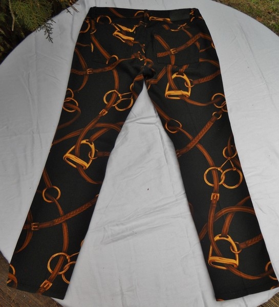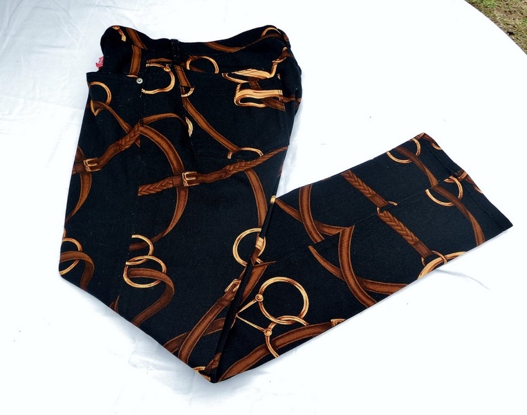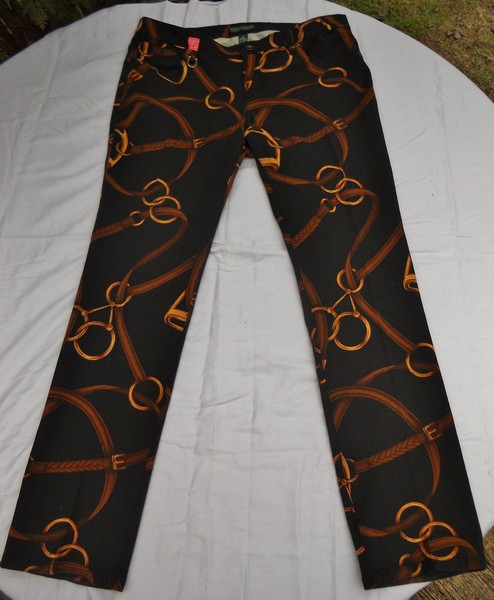 For Sale: Vintage Ralph Lauren Jeans Co Stirrup/bridle print jeans. Womens size 12, but measure yourself and then compare to measurements listed here. Mid to low waisted. 4" zipper w/riveted logo button above it. Metal "lucky" horse Shoe on front belt loop. Black RLL logo patch on back waistband. Traditional 5 pocket Jeans/ belt loops. 98% cotton-2% elastic made in Philippines.